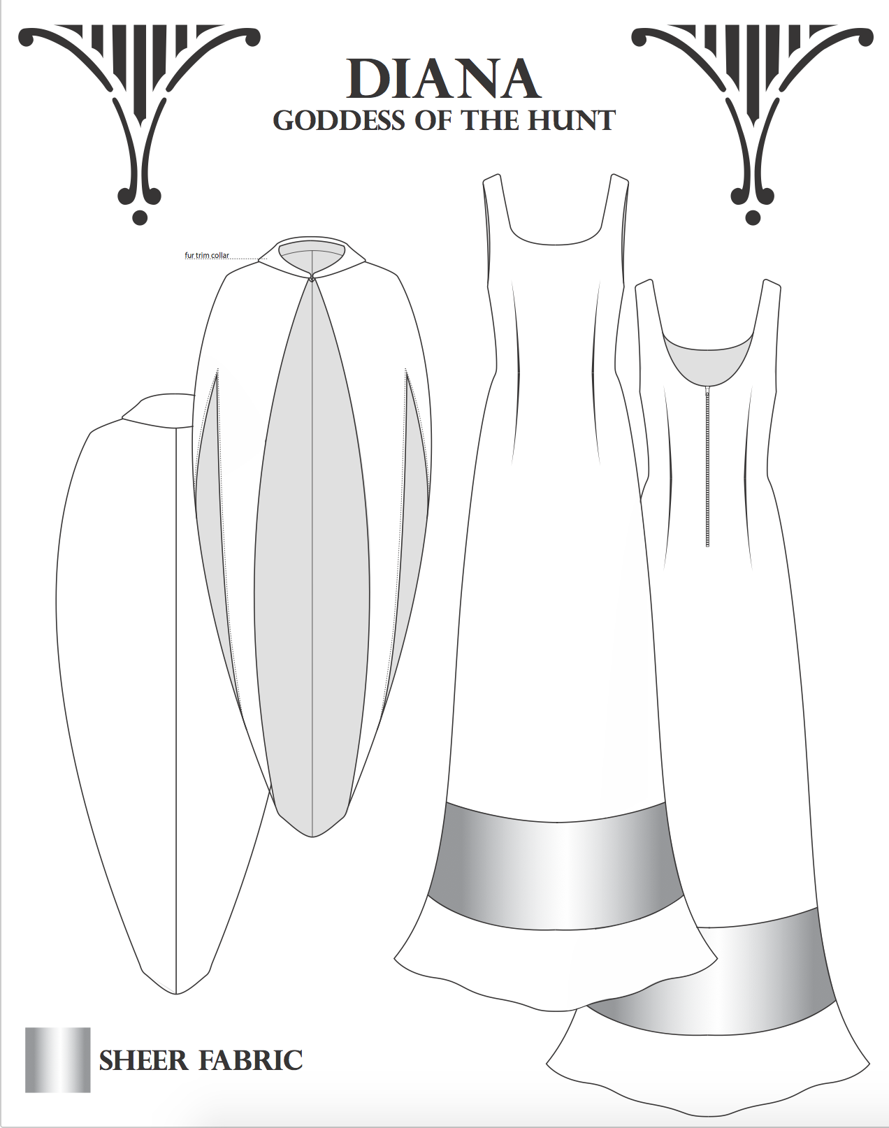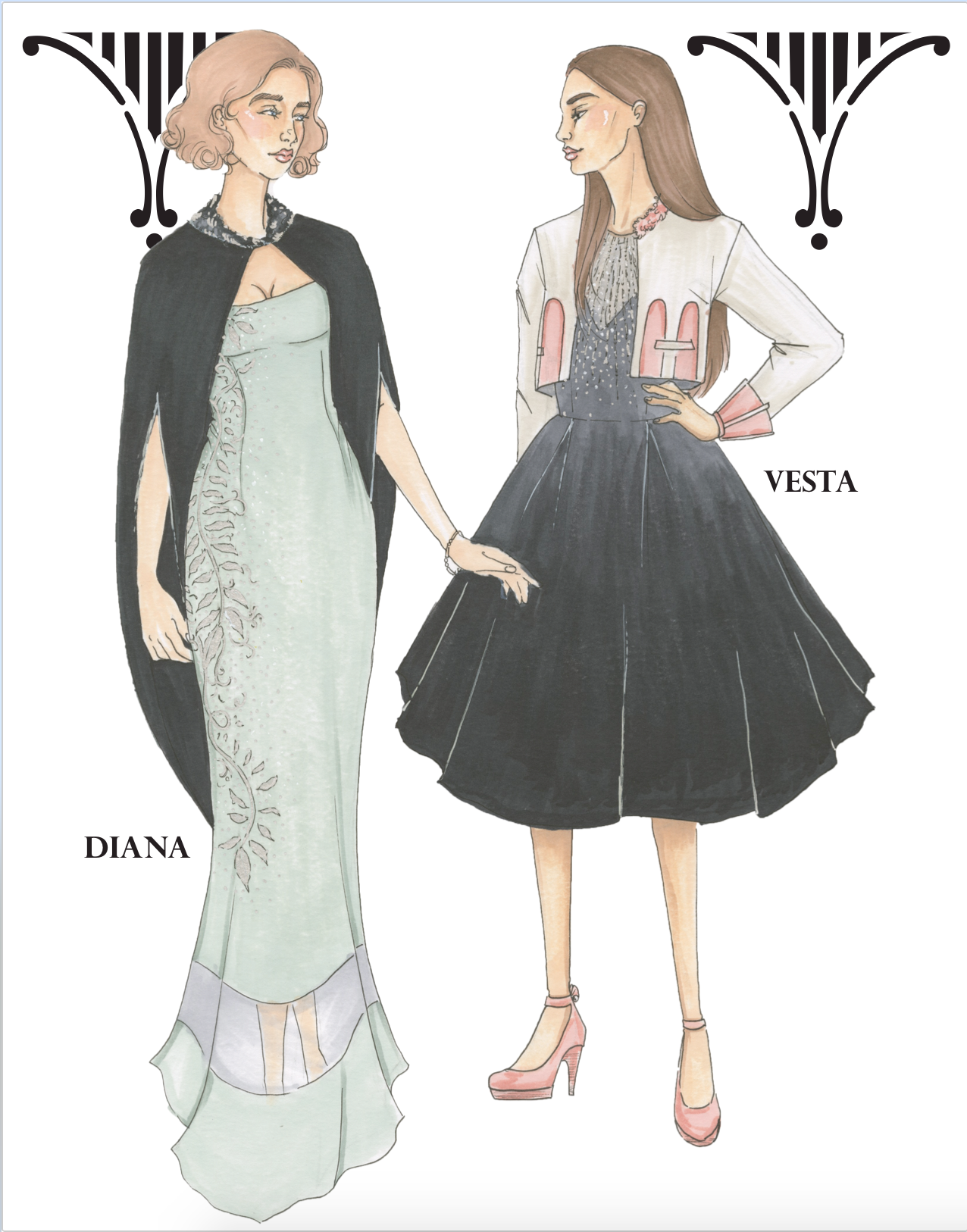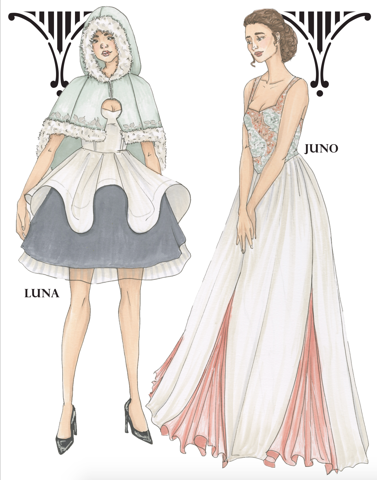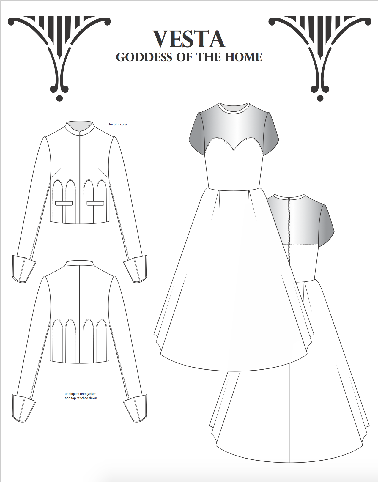 Inspired by my own personal photos of Italian architecture during my time in Italy (including Florence, Rome, and Pisa). Each ensemble is named and inspired after a Roman Goddess. This group is a technical project and required spec sheets and measurements for three garments.